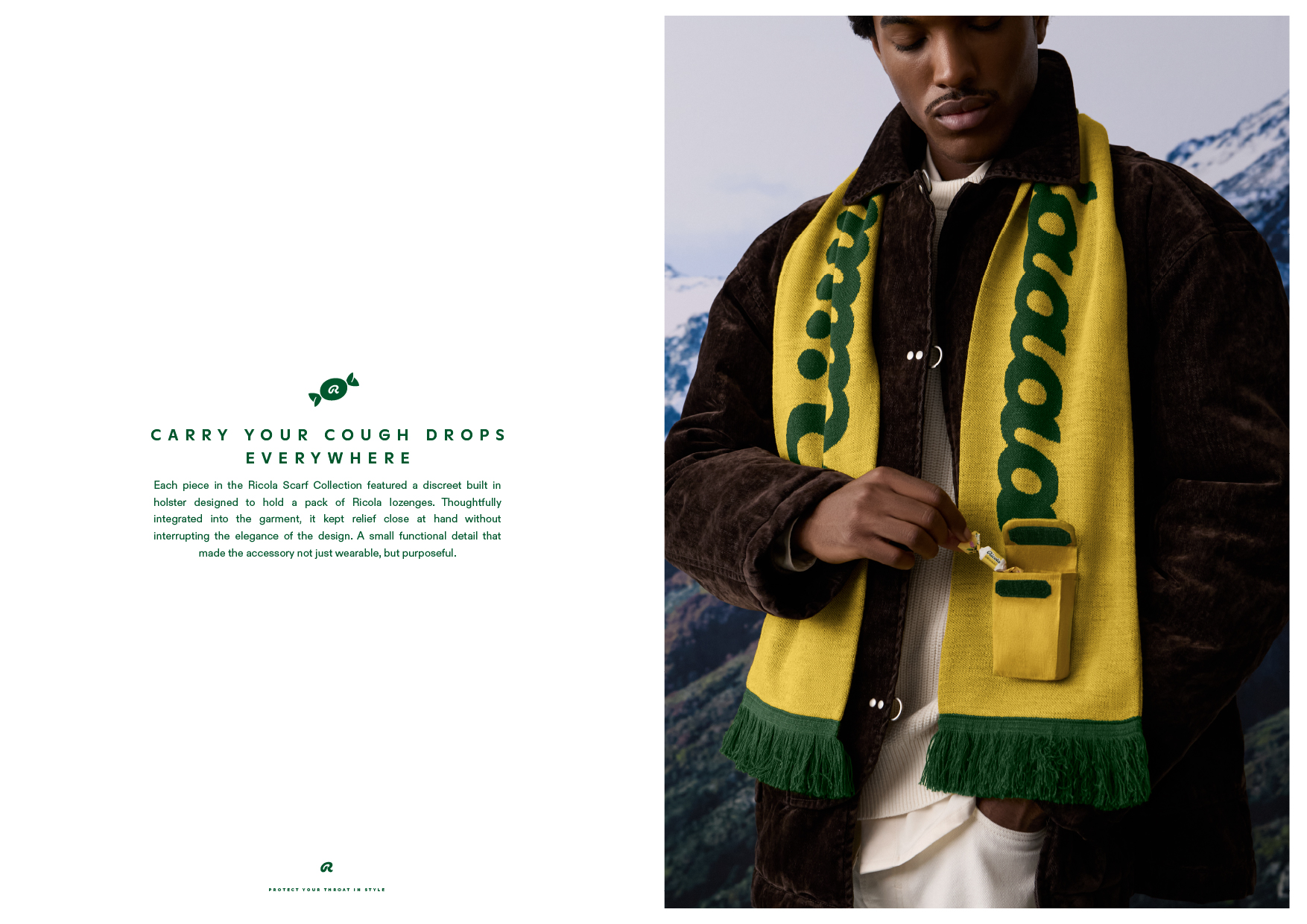 Introducing Ricola's Winter Collection: a line of cough drop-scented scarves infused with Ricola's signature Swiss alpine herbs. These fashion statements are designed in Europe from premium textiles, lightly scented with natural essential oils, and designed with a small hidden pocket for stashing cough drops on the go.